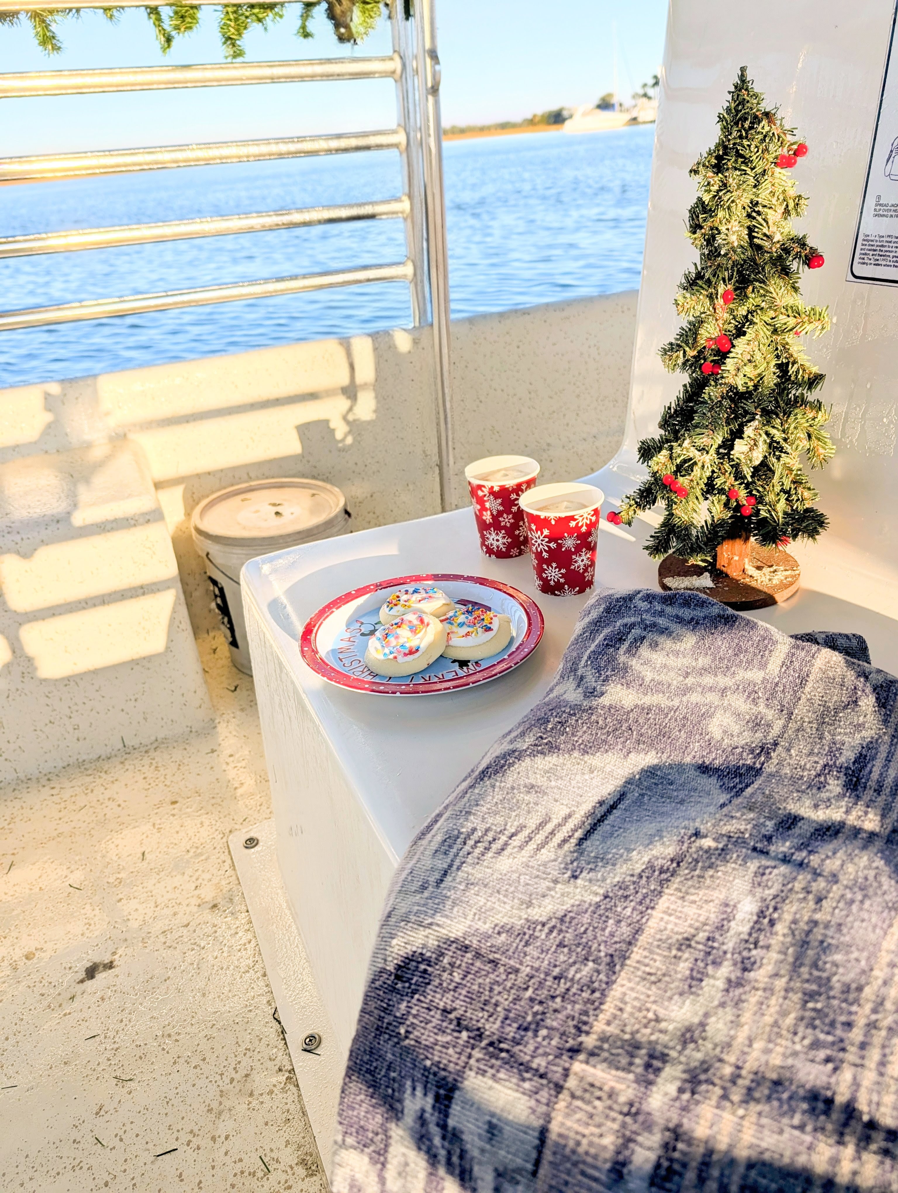 Our boat will be decorated all season! Join our 2 hour public salt marsh tour or sunset cruise to join the Christmas fun.