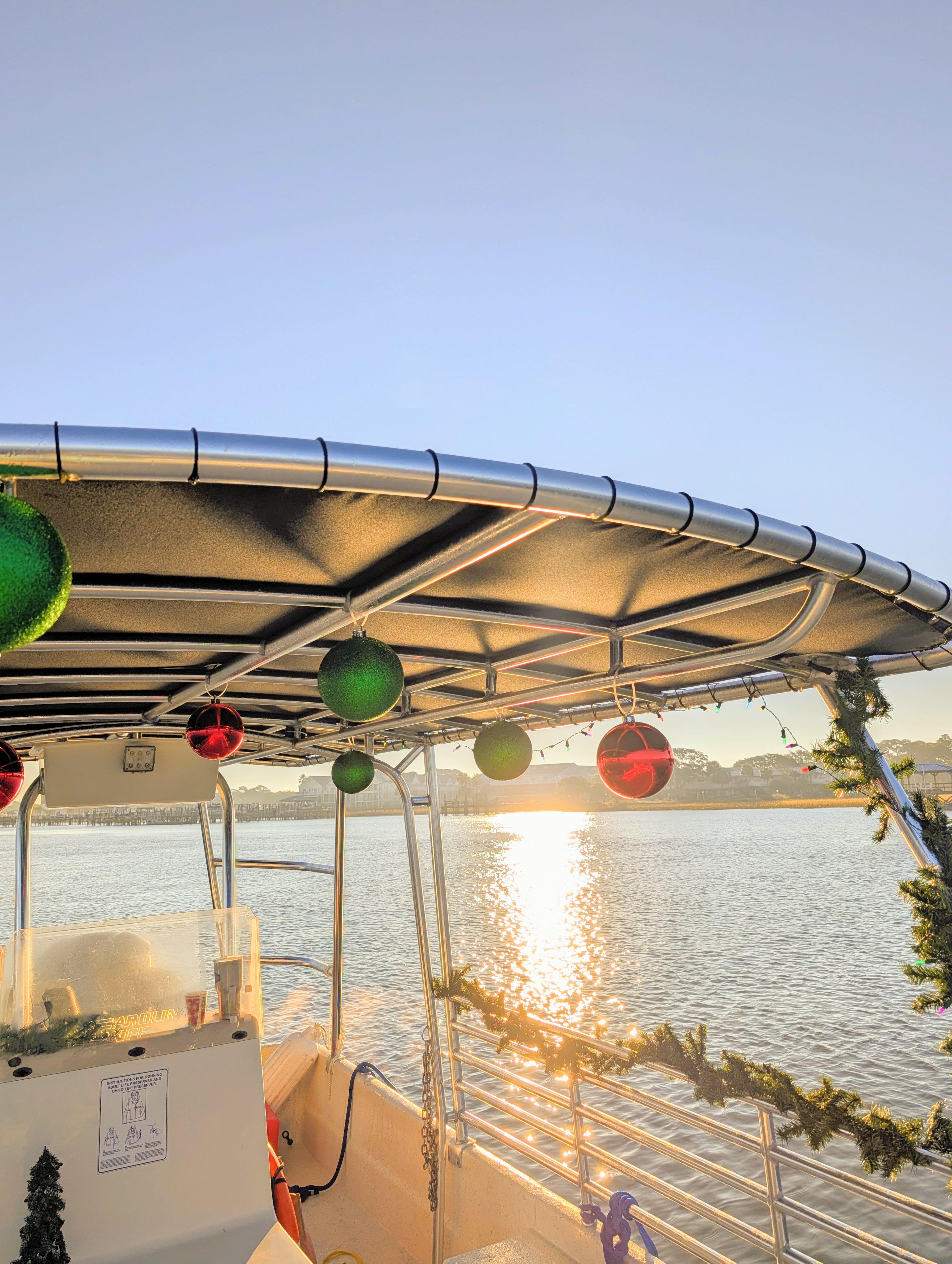 Our boat will be decorated all season! Join our 2 hour public salt marsh tour or sunset cruise to join the Christmas fun.
